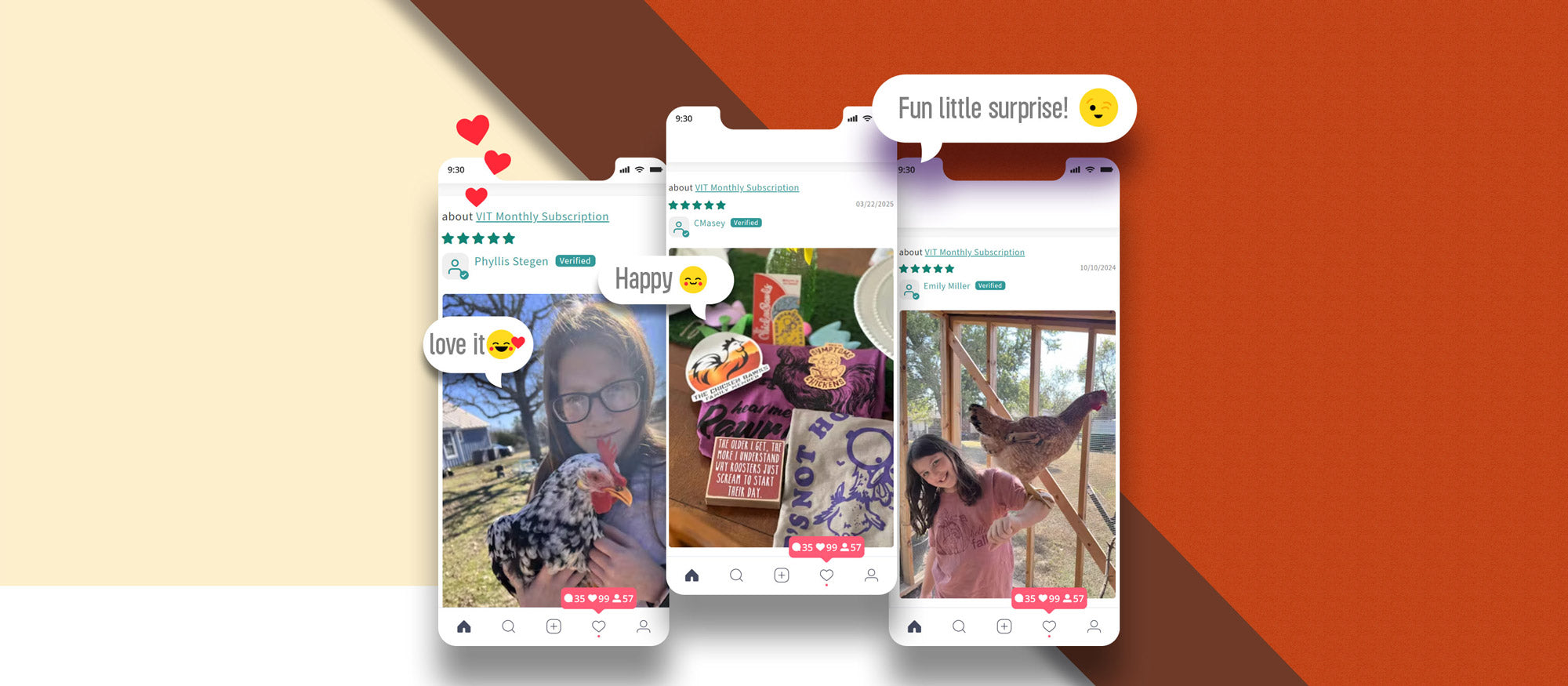 I enjoy opening the mailbox and seeing my monthly subscription. I love the adorable shirts along with amazing fabric. I wear my chicken shirts almost every day. And the little cute little surprises I need. I love the stickers. I would recommend everyone who loves their Chickens to subscribe to the chicken box.