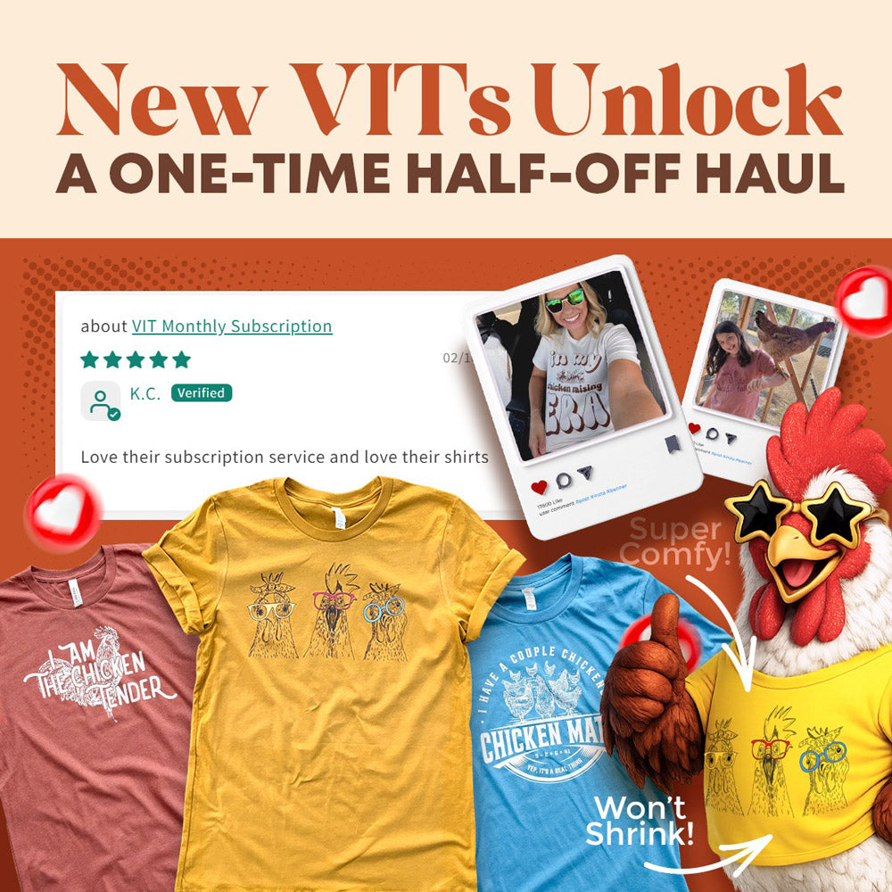 After you join today, you’ll get a private link for a one-time shop order at 50% off. Stock up your coop right away, then enjoy a fresh tee every month.